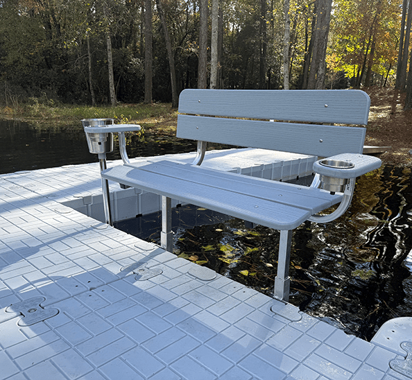 The bench mounts easily to your modular dock system using (4) Male Half Couplers (SKU: HALFCPLR-GR-ASSY), providing a secure connection while maintaining the flexibility to reposition or expand your dock layout as needed. Ideal for gatherings, leisure, or simply enjoying your waterfront, the Snap Dock Bench offers both functionality and aesthetic appeal.