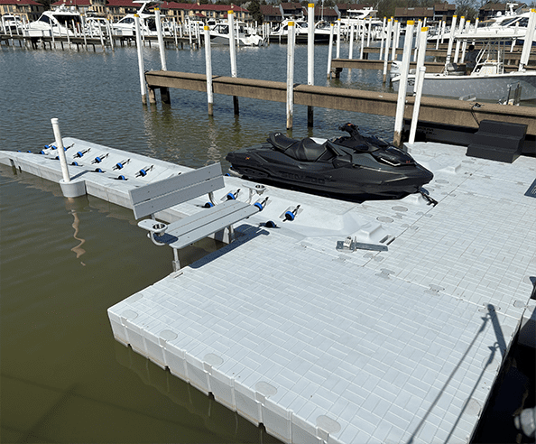 The Snap Dock Bench (SKU: BENCH-GR-ASSY) is a stylish and durable seating solution designed for use on residential and commercial floating docks. Featuring a comfortable vinyl seating surface paired with a corrosion-resistant stainless steel frame substructure, this bench combines long-lasting strength with all-weather comfort. Its sleek design complements any dock setup while providing a safe and inviting place to relax by the water.